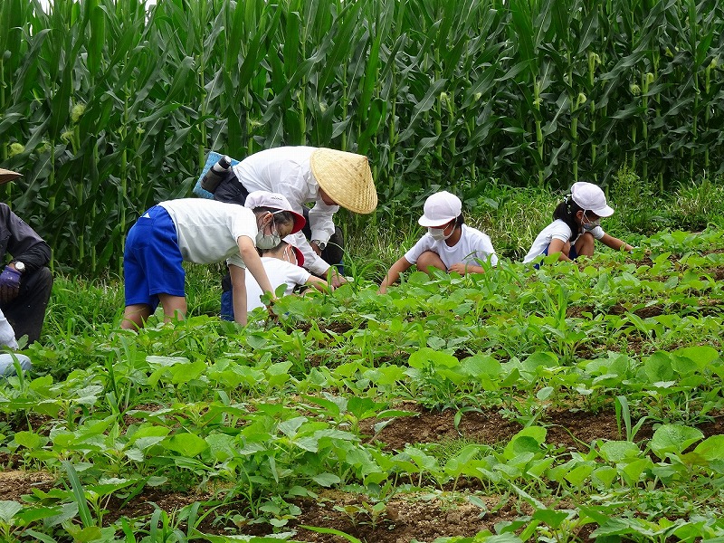 一緒に畑の草取りをしたり、集会所で交流をしたりしました。