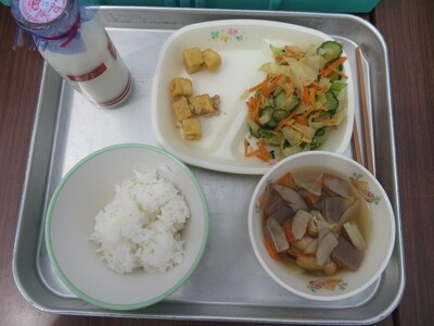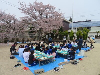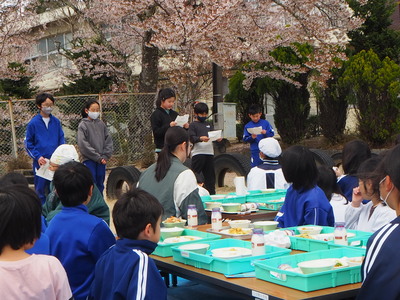 お花見給食🌸 昨日の全校写真撮影に引き続き、今日も全校で桜を楽しみました。 児童会 代表委員会が計画してのお花見給食です。 今日の献立は【ごはん・凍り豆腐の肉みそ和え・けんちん汁・牛乳】 風が強く寒い日でしたが、なかよし班ごとに楽しく食べることができました。 編集者2026-04-10T09:43:27+09:002026年04月10日|