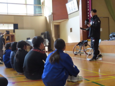 ↑ 5・6年生 パラアイスホッケー日本代表主将の熊谷昌治選手にお越しいただき、お話を伺ったり、車いす体験を行いました。